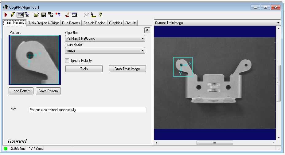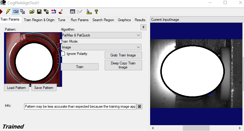 PMAlign 编辑控件为 CogPMAlignTool 及其组件提供了图形用户界面,这使你能够训练一个模式,然后让该工具在连续的输入图像中搜索它。你可以指定在执行模式训练或模式搜索时要使用的算法类型,并在从图像或从一组形状模型中创建训练模式之间进行选择。模式搜索可以通过输入图像中的可选搜索区域进行约束