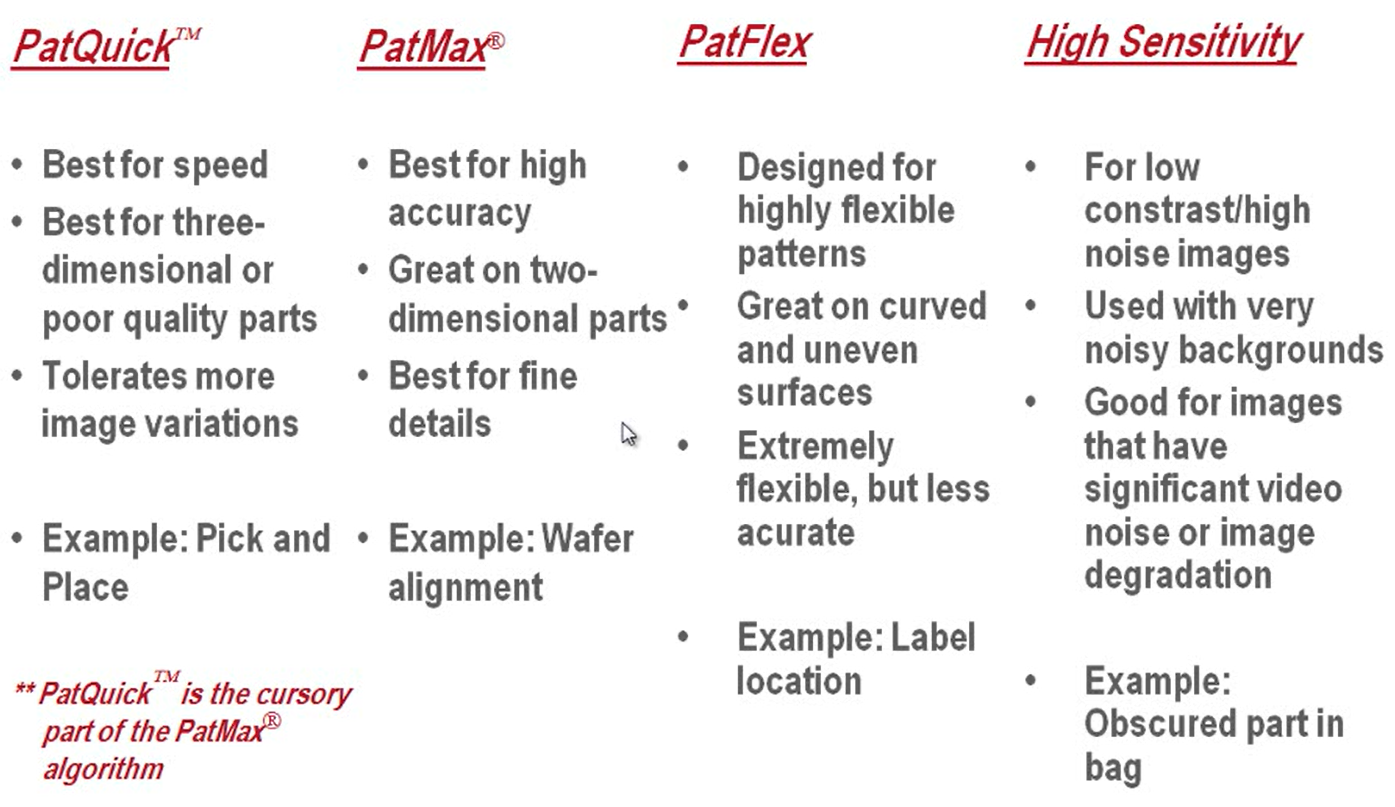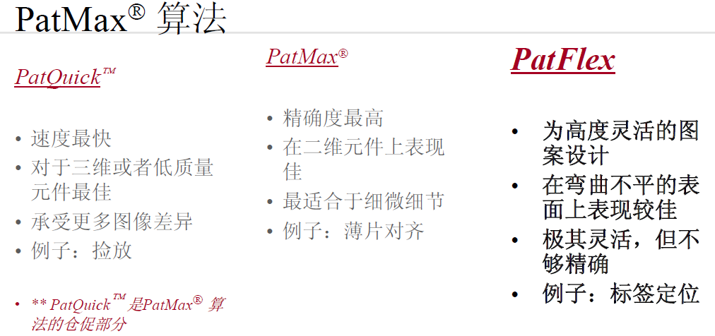 - PatMax 精度最高,在二维原件上表现最佳,最适合细微细节。