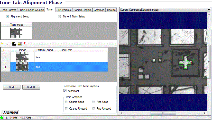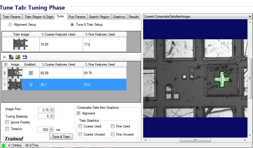 在调整的对齐设置阶段,您可以使用 “调整(Tune)” 选项卡上的控件来管理存储在此模式的 CogPMAlignComposite 对象的 CompositeData 集合中的图像和对齐位姿(Poses)集合。