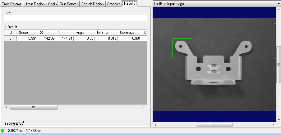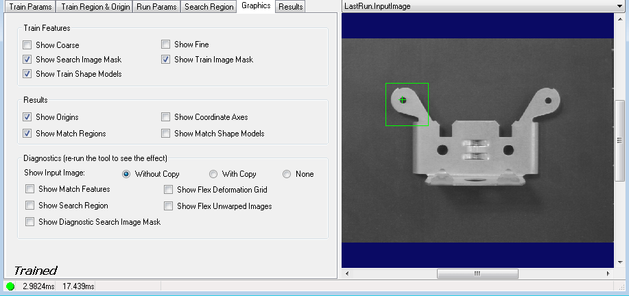 您可以在 LastRun.InputImage 缓冲区中显示这些特征,该缓冲区包含 PMAlign 工具上次搜索的图像以及该搜索的结果。使用 CreateResultGraphics 方法生成这些结果。