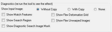 “显示弹性展开图像(Show Flex Unwarped Images)” 复选框将显示输入图像的展开版本。在与已训练图案对应的区域内展开最为准确。您必须为运行时算法指定 PatFlex,并且在选中此复选框后必须重新运行该工具才能看到结果。