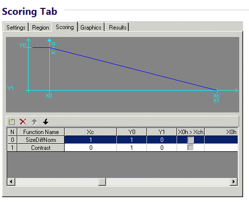 该选项卡底部的列表显示您已添加到集合中的函数。当您突出显示一个计分函数时,该选项卡会显示该计分函数的图形,并标注您指定的函数参数。