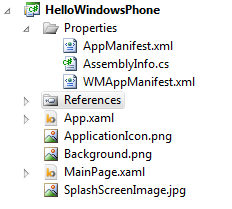 | Properties\WMAppManifest.xml: | 一个包含与Windows Phone Silverlight应用程序相关的特定元数据的清单文件,且包含了用于Windows Phone的Silverlight所具有的特定功能; |