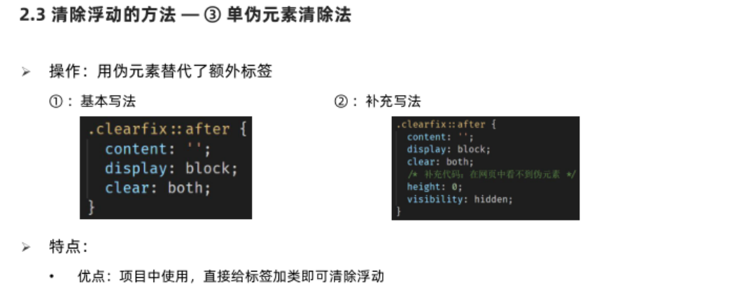 清除浮动的方法:1 直接设置父元素高度 2 额外标签法:1. 在父元素内容的最后添加一个块级元素; 给添加的块级元素设clear:both
