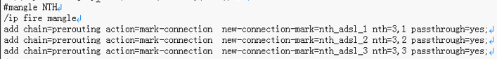 IP —— Firewall —— Mangle —— 点击加号 —— (General) —— Chain:prerouting —— Src.Address:源地址网段 ——Connection State:勾选new(新建的连接,不影响之前的) —— (Action) —— Action:mark connection —— New Connection Mark:adsl_nth_1 —— 勾选Passthrough(yes,将该标记的数据继续向下传) —— (Extra) —— Nth——Every:3——Packet:1