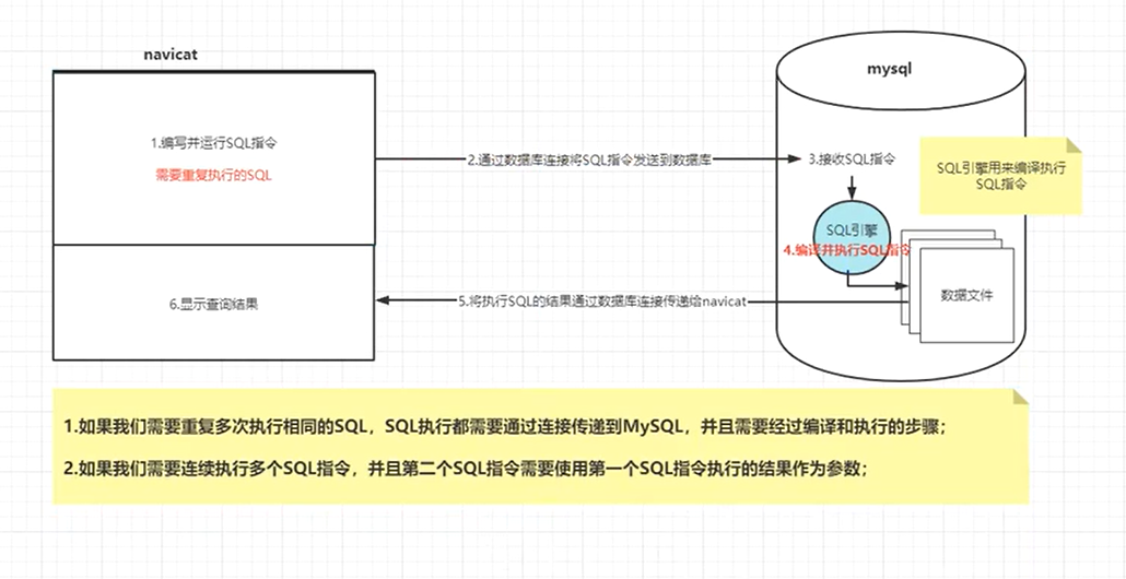 - 将能够完成特定功能的SQL指令进行封装(SQL指令集),编译之后存储在数据库服务器上,并且为之取一个名字,客户端可以通过名字直接调用这个SQL指令集,获取执行结果
