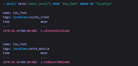 上面的sql使用了MEAN函数,来对h2o_feet这个measurement中的location这个tag进行分组求平均值。