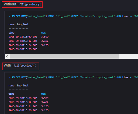 fill(<fill_option>) 是可选的。它可以填充那些没有数据的时间区间的值。 从 [GROUP BY time intervals and fill() ] (https://docs.influxdata.com/influxdb/v1.7/query_language/data_exploration/#group-by-time-intervals-and-fill) 部分可查看到关于这部分的更多信息。注:基本的GROUP BY time()查询通过当前InfluxDB数据库的预设时间边界来确定每个时间间隔中包含的原始数据和查询返回的时间戳。