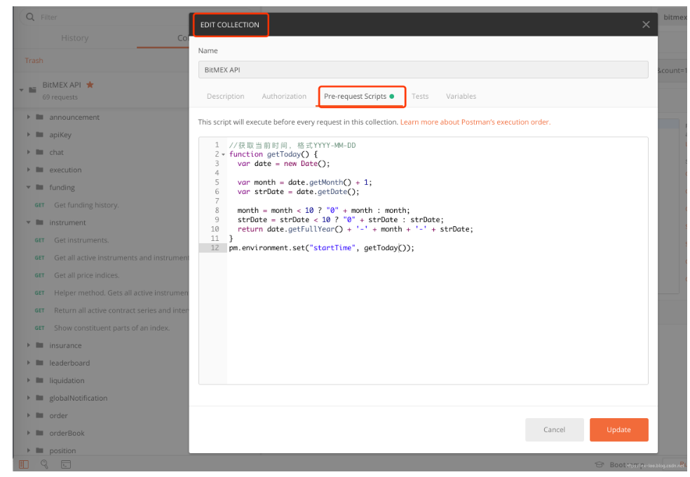 - 因为每个接口上的相同参数的名字是是一样的,所以我们可以为整个collection或者folder设置统一的pre-script