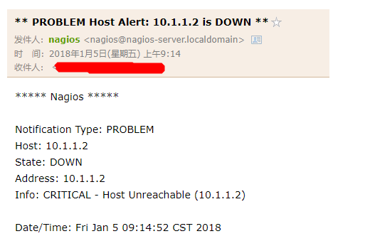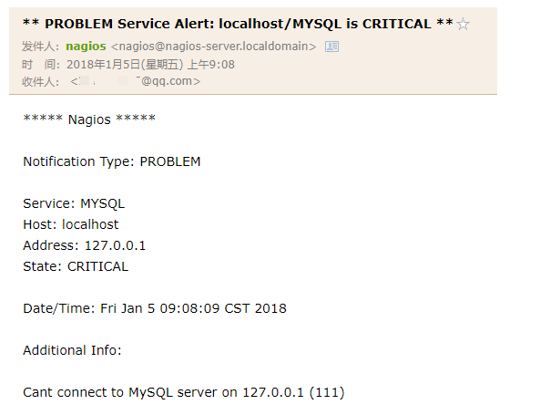 [root@nagios-server ~]# ping www.baidu.com PING www.a.shifen.com (119.75.213.61) 56(84) bytes of data. 64 bytes from 127.0.0.1 (119.75.213.61): icmp_seq=1 ttl=128 time=6.94 ms [root@nagios-server ~]# echo test nagios |mail -s 'nagios' 39xxxx85@qq.com