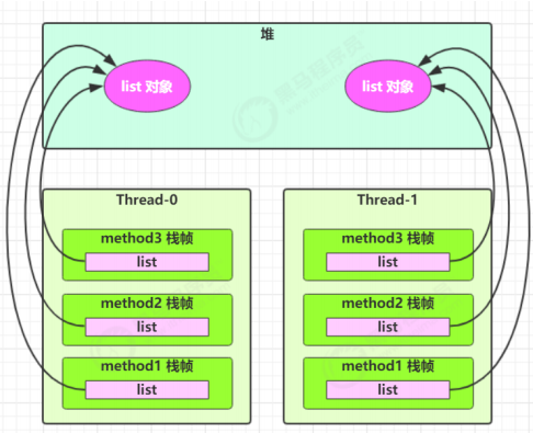 - 每个栈由多个栈帧(Frame)组成,对应着每次方法调用时所占用的内存