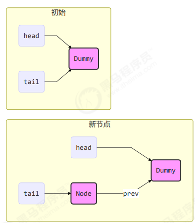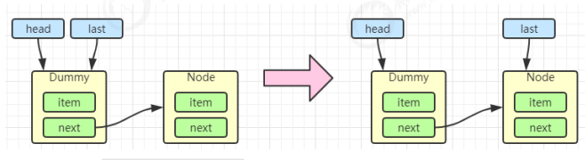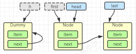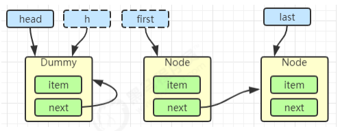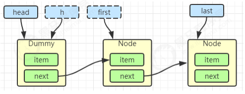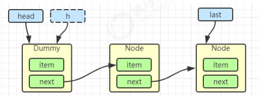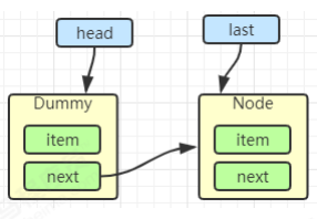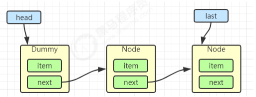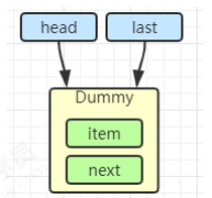 初始化链表 last = head = new Node(null); Dummy 节点用来占位,item 为 null