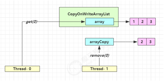CopyOnWriteArrayList<Integer> list = new CopyOnWriteArrayList<>(); list.add(1); list.add(2); list.add(3); Iterator<Integer> iter = list.iterator(); new Thread(() -> { list.remove(0); System.out.println(list); }).start(); sleep1s(); while (iter.hasNext()) { System.out.println(iter.next()); }