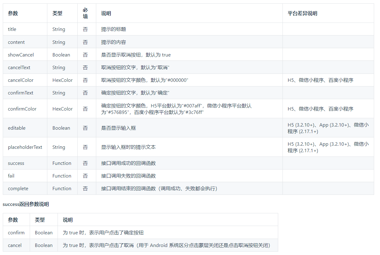 显示模态弹窗,可以只有一个确定按钮,也可以同时有确定和取消按钮。类似于一个API整合了 html 中:alert、confirm。