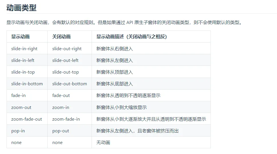 - type: [String], 内置的特殊子窗体类型,弹出(popup)和导航(navigationBar)。一旦设置 type为navigationBar或 popup,position和dock 的值都会被忽略。
