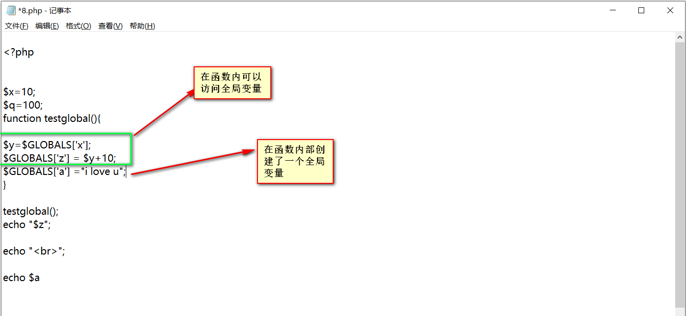 GLOBALS['已知局部变量名'] = 新的值;,但是我们可以在函数内把变量装到GLOBALS那个大盒子里!