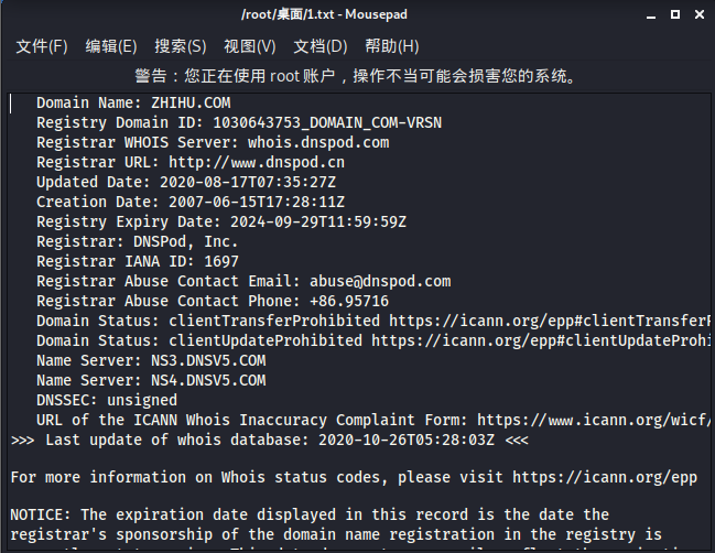 (1) whois 要查询的域名 kali 的 msfconsole或kali机器上,用于查询具体的注册信息