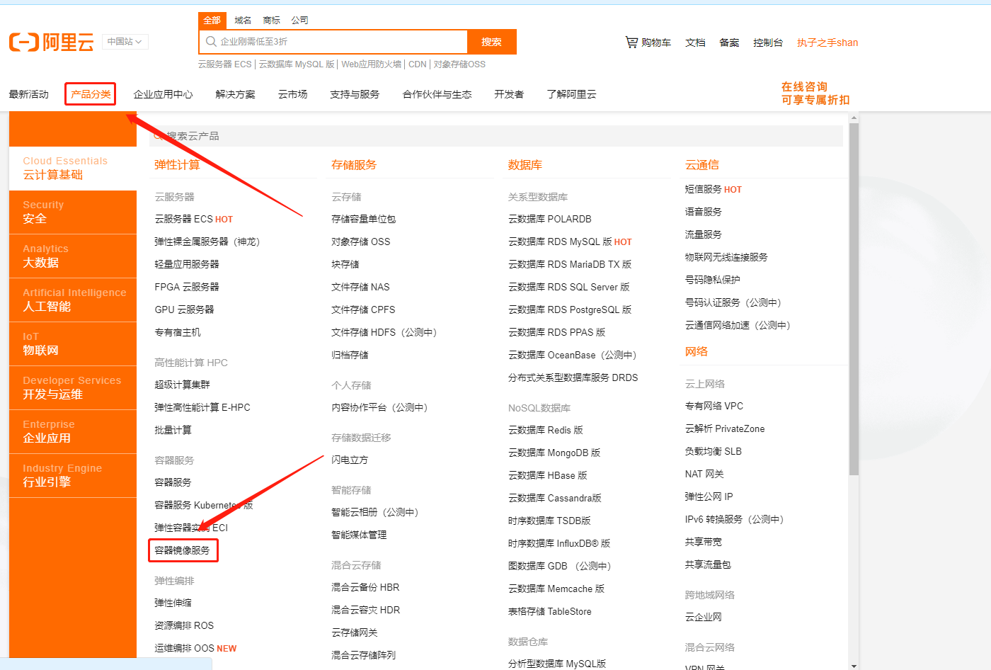 第二步:选择产品分类栏下面云计算基础中的容器镜像服务