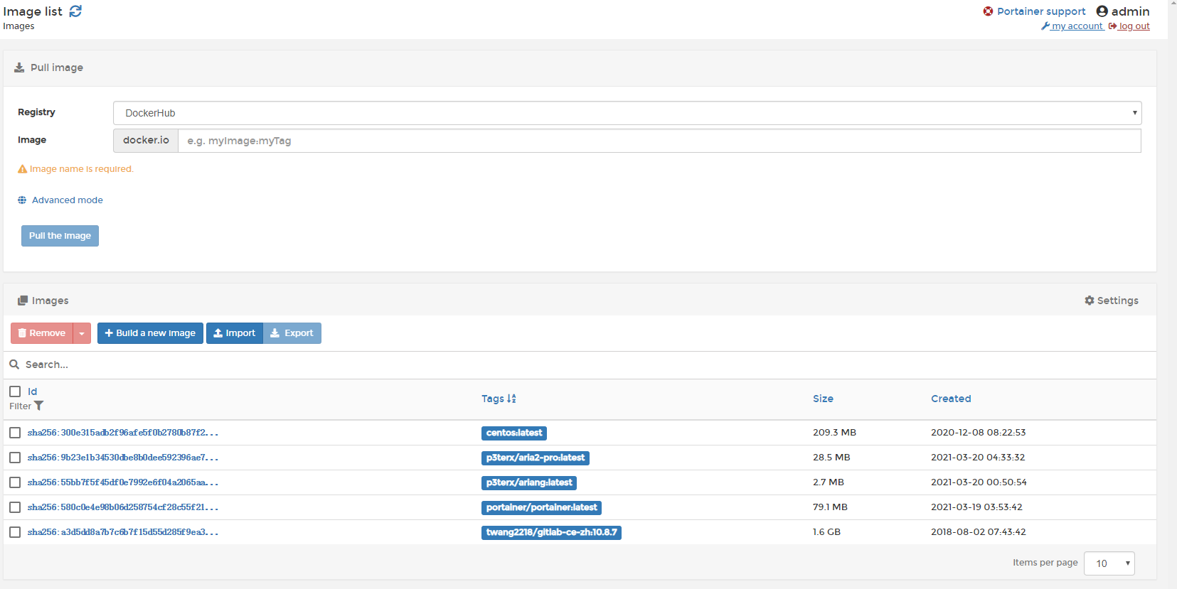 七、点击上图中的images,进入镜像的管理页面,可以进行添加、移除、导入、导出以及打包镜像操作