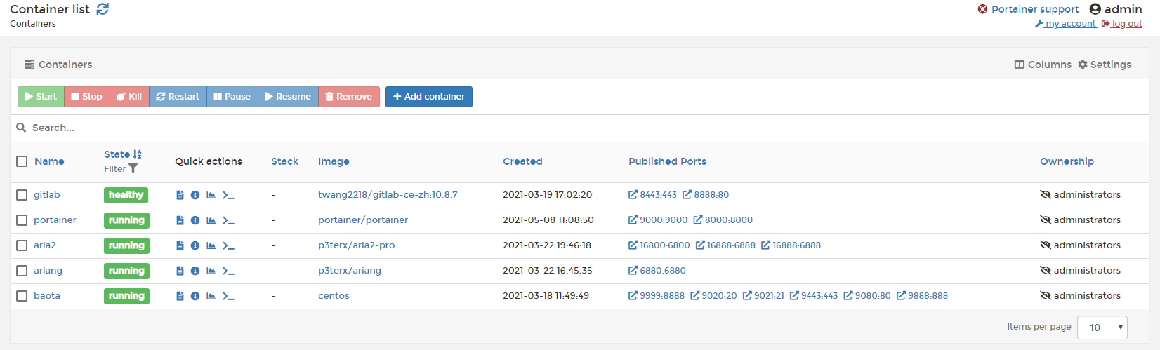 八、点击第六步图中的Containers,可以进入容器的管理页面,可以进行启动、停止、移除、添加等等操作,还可以查看容器的日志、端口映射关系、容器配置信息、容器控制台等等操作