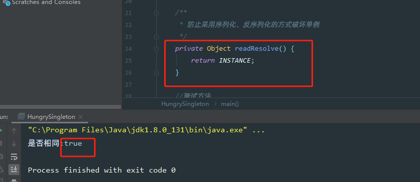 六、所以如何防止饿汉式单例被破坏?需要添加一个readResolve方法并且方法中返回实例即可。