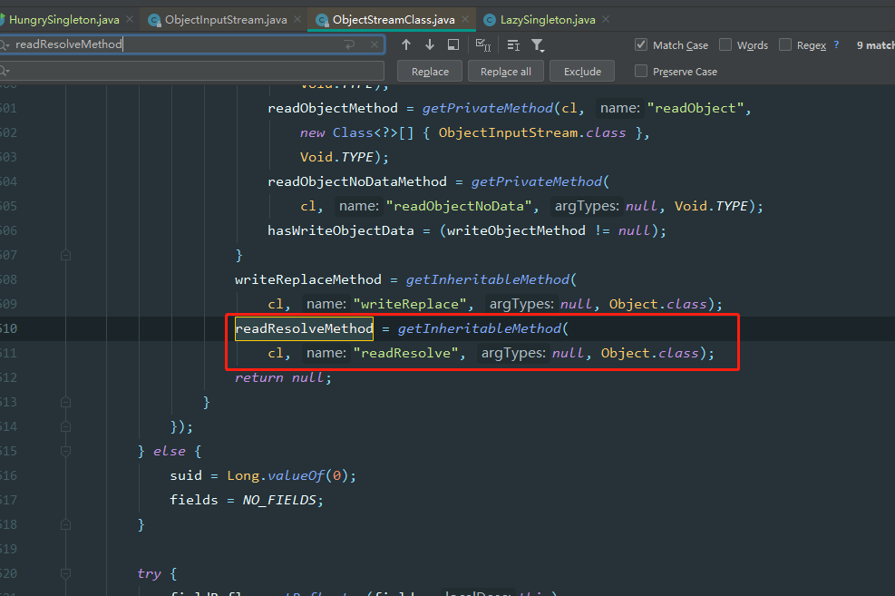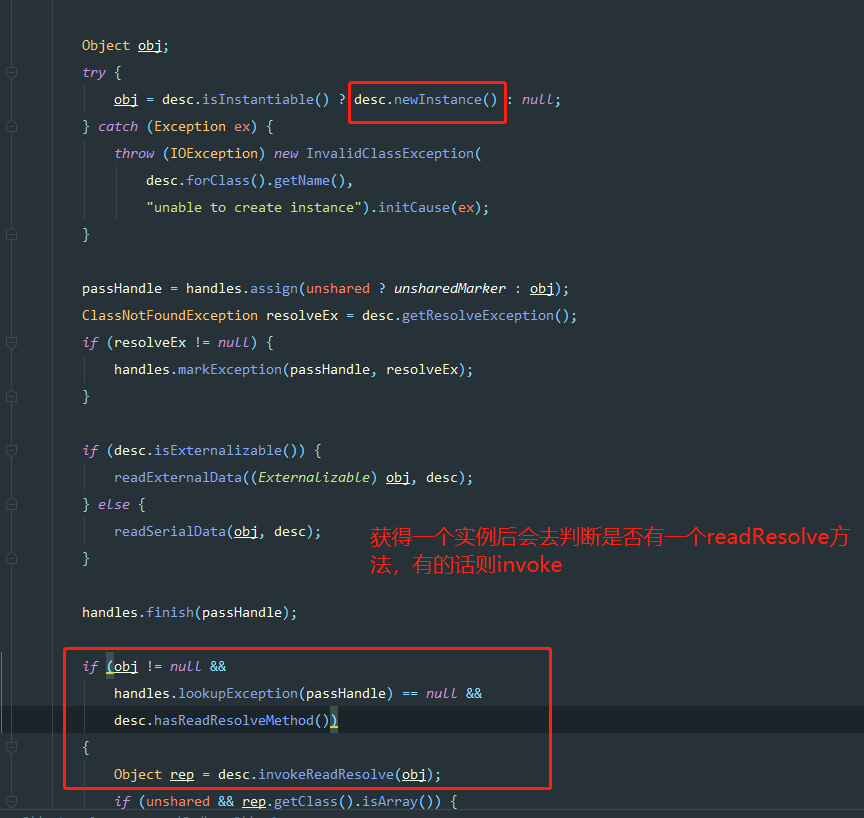 结论:反序列化时如果没有readResolve方法则会返回newInstance的实例,所以导致“单例”被破坏了,如果有readResolve方法则会调用此方法,返回readResolve方法返回的对象