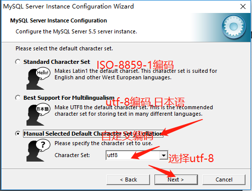 14.设置mysql的默认编码,自定义,一般选择utf-8,点击下一步