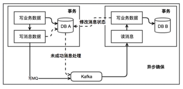 消息生产方,需要额外建一个消息表,并记录消息发送状态。消息表和业务数据要在一个事务里提交,也就是说他们要在一个数据库里面。然后消息会经过MQ发送到消息的消费方。如果消息发送失败,会进行重试发送。
