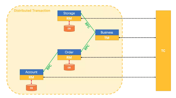 Transaction Coordinator (TC): 事务协调器,维护全局事务的运行状态,负责协调并驱动全局事务的提交或回滚。