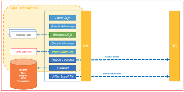 Resource Manager (RM): 控制分支事务,负责分支注册、状态汇报,并接收事务协调器的指令,驱动分支(本地)事务的提交和回滚。