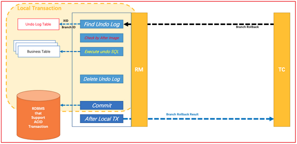 如果决议是全局回滚,RM 收到协调器发来的回滚请求,通过 XID 和 Branch ID 找到相应的回滚日志记录,通过回滚记录生成反向的更新 SQL 并执行,以完成分支的回滚。