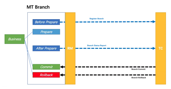 业务逻辑需要被分解为 Prepare/Commit/Rollback 3 部分,形成一个 MT 分支,加入全局事务。
