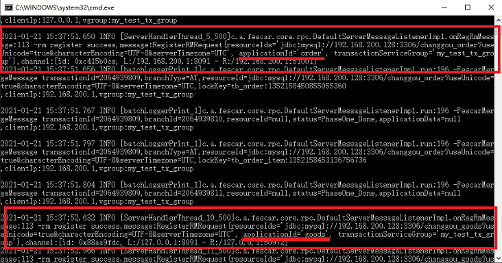 重启时注意准备阶段打开的fescar客户端,发现两个模块都注册到了fescar