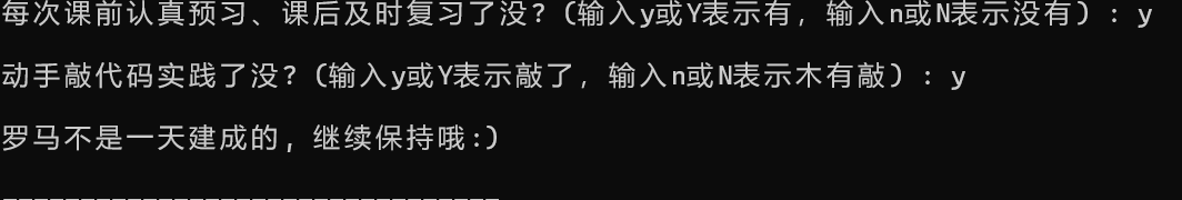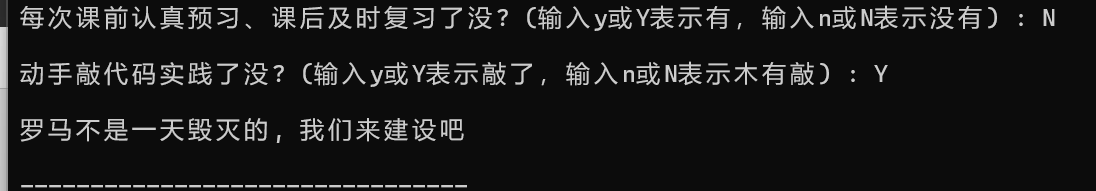 1 #include <stdio.h> 2 int main() 3 { 4 char ans1, ans2; // 用于保存用户输入的答案 5 printf("每次课前认真预习、课后及时复习了没? (输入y或Y表示有,输入n或N表示没有) : "); 6 ans1 = getchar(); // 从键盘输入一个字符,赋值给ans1 7 getchar(); // 思考这里为什么要加这一行。试着去掉这一行,看看对运行有没有影响。 8 printf("\n动手敲代码实践了没? (输入y或Y表示敲了,输入n或N表示木有敲) : "); 9 ans2 = getchar(); 10 if (ans1==ans2||ans1==ans2+32||ans2==ans1+32) // 待补足,判断用户回答ans1和ans2都是小写y或大写Y 11 printf("\n罗马不是一天建成的, 继续保持哦:)\n"); 12 else 13 printf("\n罗马不是一天毁灭的, 我们来建设吧\n"); 14 return 0; 15 }