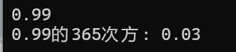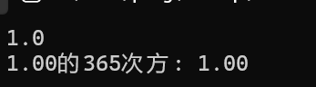 1 #include <stdio.h> 2 #include <math.h> 3 int main() 4 { 5 double x, ans; 6 scanf("%lf", &x); 7 ans = pow(x, 365); 8 printf("%.2f的365次方: %.2f\n", x, ans); 9 10 return 0; 11 }