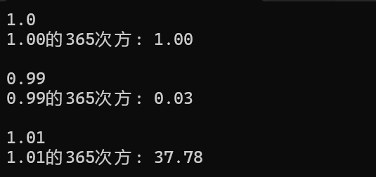 1 #include <stdio.h> 2 #include <math.h> 3 int main() 4 { 5 double x, ans; 6 while (scanf("%lf", &x) != EOF) 7 { 8 ans = pow(x, 365); 9 printf("%.2f的365次方: %.2f\n", x, ans); 10 printf("\n"); 11 } 12 return 0; 13 }