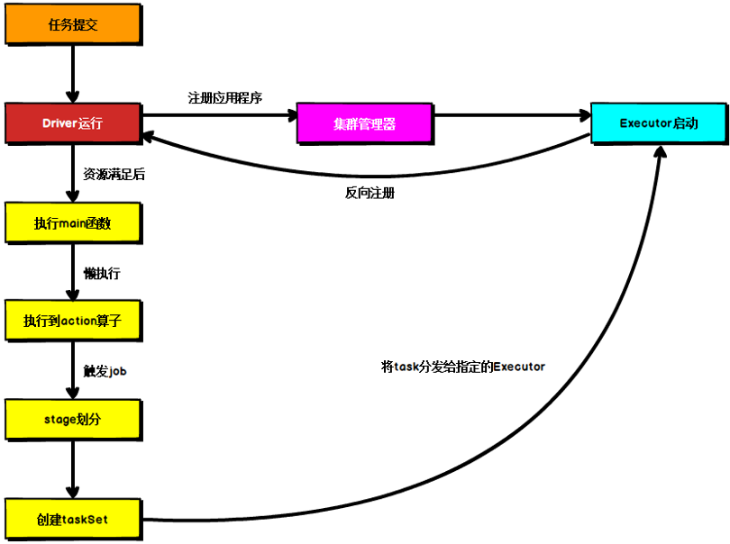 - 所有的Executor注册完成后,Driver开始执行main函数,之后执行到Action算子时,开始划分Stage,每个Stage生成对应的taskSet,之后将Task分发到各个Executor上执行。