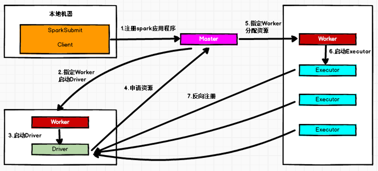 - Driver启动后向Master注册应用程序,Master在Worker启动Executor