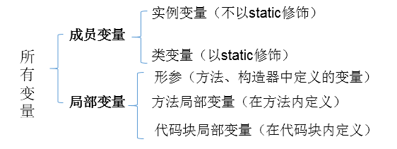 局部变量:声明在方法内、方法形参、代码块内、构造器形参、构造器内部的变量