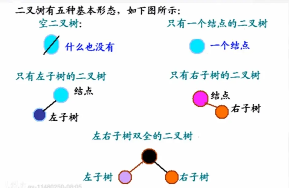 非空二叉树只有一个根结点,每个结点最多有两颗子树,分别称为左子树和右子树