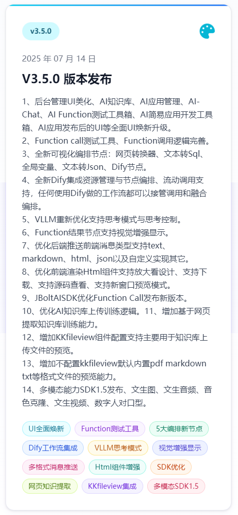 2025年7月14日,JBoltAI团队正式发布了备受期待的v3.5.0版本。这一版本不仅在功能上进行了全面升级,还引入了多项创新技术,旨在为开发者提供更加高效、便捷的AI开发体验。