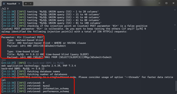 直接跑出来了,不过用的是布尔盲注和时间盲注