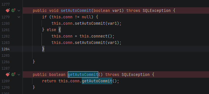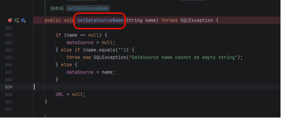 setDataSourceName/getDataSourceName直接搜索搜不到函数,只能找到接口和定义。要找setAutoCommit/getAutoCommit,需要用 双击 Shift 搜索类名JdbcRowSetImpl,定位到JdbcRowSetImpl.class后再找对应方法。