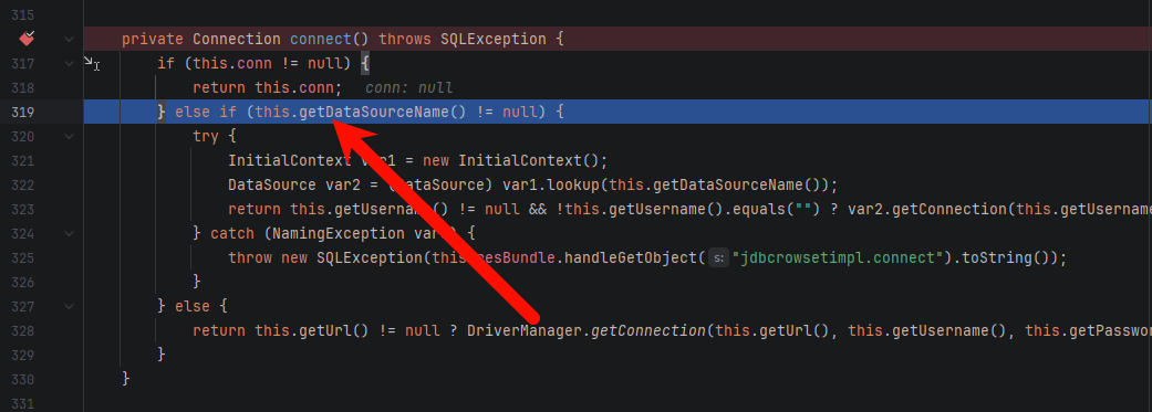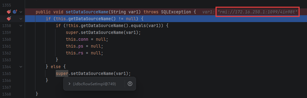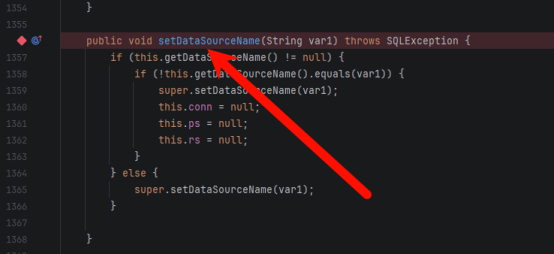 再跑一遍调试,进入反序列化函数后,直接跳到下一个断点,到达了 setDataSourceName: