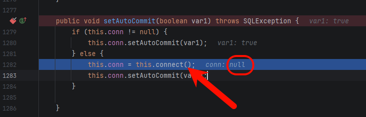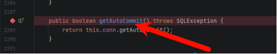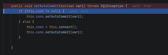 进入 setAutoCommit,conn 为 null,走 else 分支: