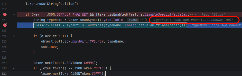 目标服务器拿到这段 JSON 开始解析,FastJson 在 DefaultJSONParser 里发现了 @type 字段,于是调用 TypeUtils.loadClass() 把字符串 "com.sun.rowset.JdbcRowSetImpl" 直接转成 Class 对象并实例化。这一步是整个漏洞的根源——1.2.24 及以下没有任何白名单限制,传什么类名就加载什么类。