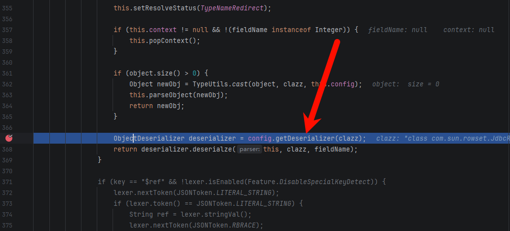 继续往下执行,发现下面有一个 Deserializer,对象就是 @type 指定的 com.sun.rowset.JdbcRowSetImpl: