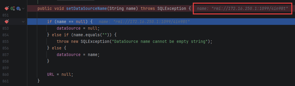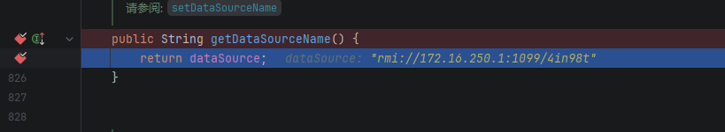 setDataSourceName 被调用,传入 RMI 地址 rmi://172.16.250.1:1099/4in98t,但此时 dataSource 为空,进入 else 判断: